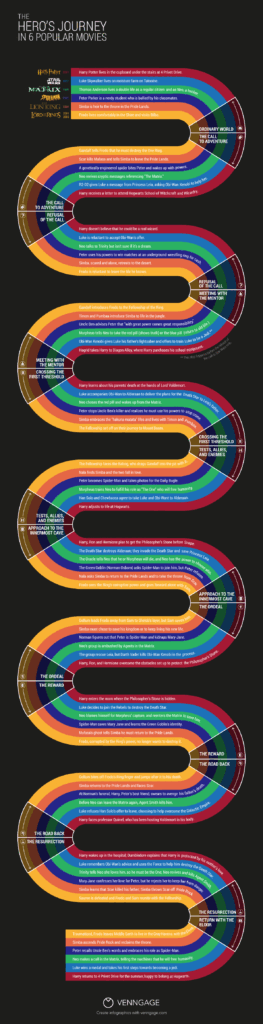 Seja usando o gráfico circular clássico, a espiral evolutiva ou infográficos digitais, as representações visuais da Jornada do Herói ajudam a traduzir um modelo teórico em uma ferramenta prática, acessível e criativa.